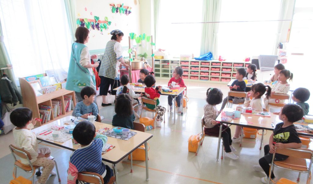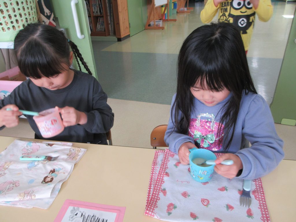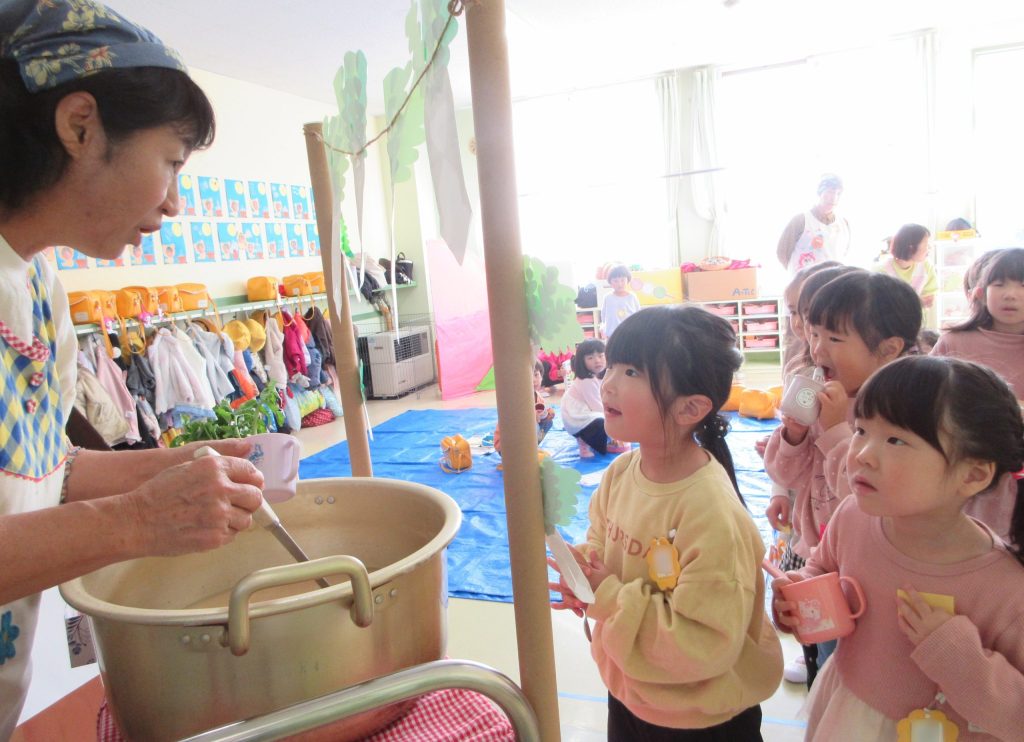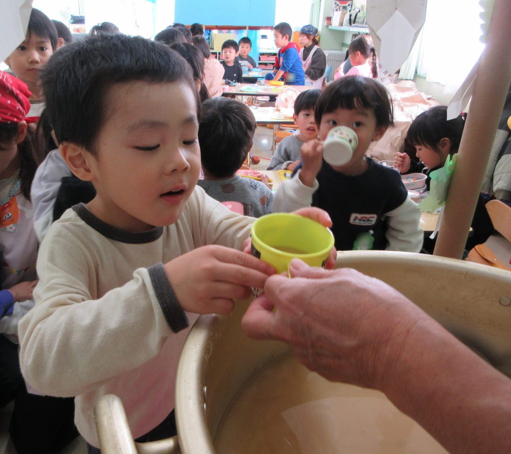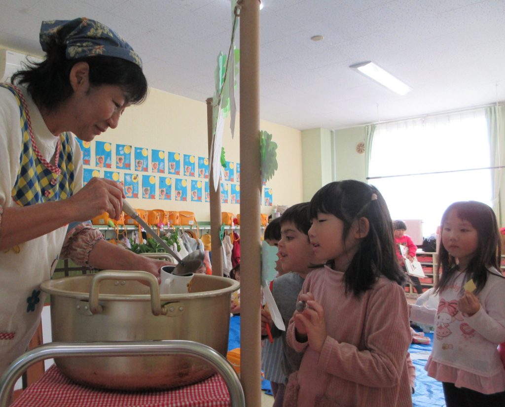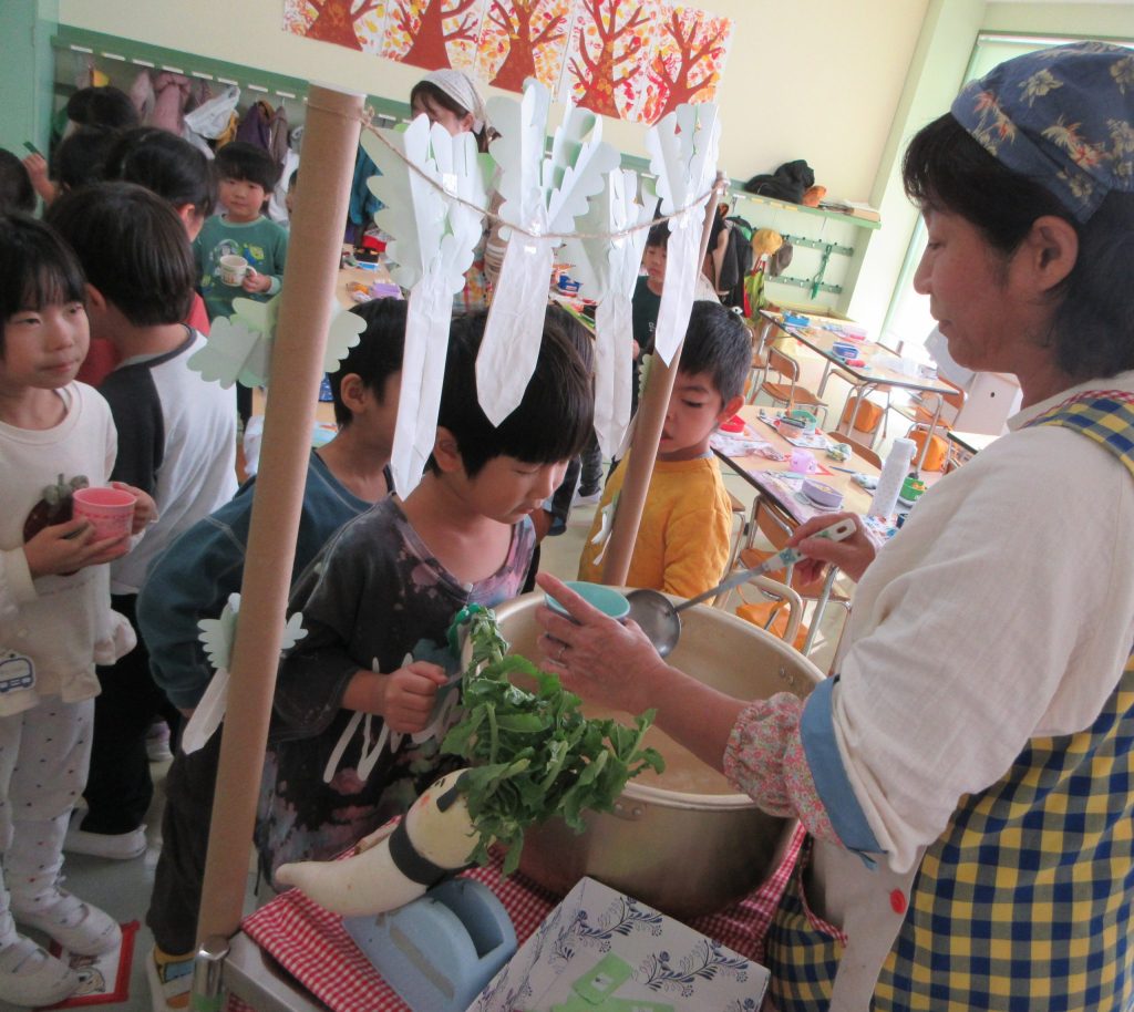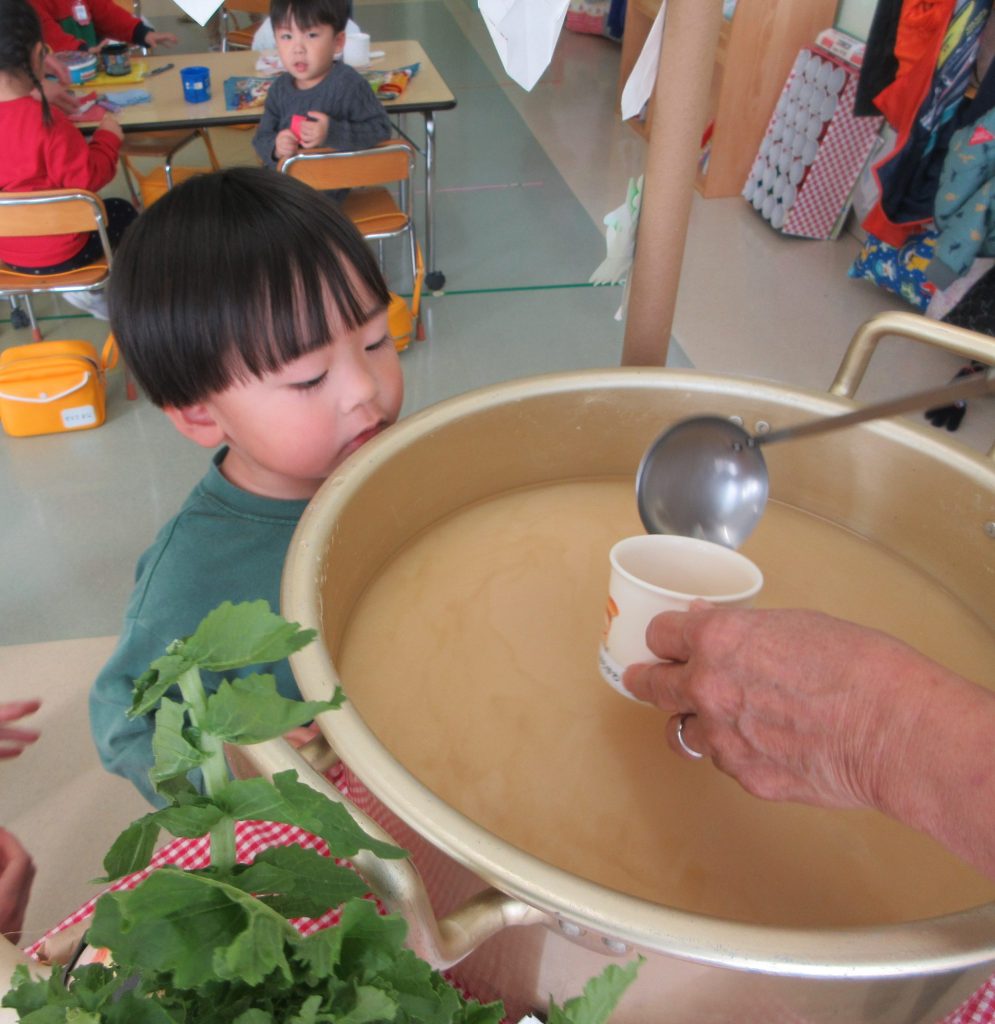 昨日、幼稚園の畑で収穫した大根を味噌汁