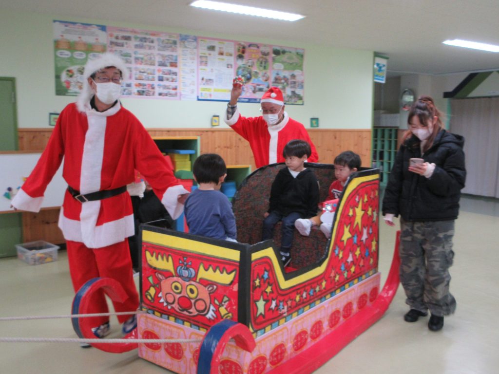 サンタさんが、ちびっこちゃんを乗せて、