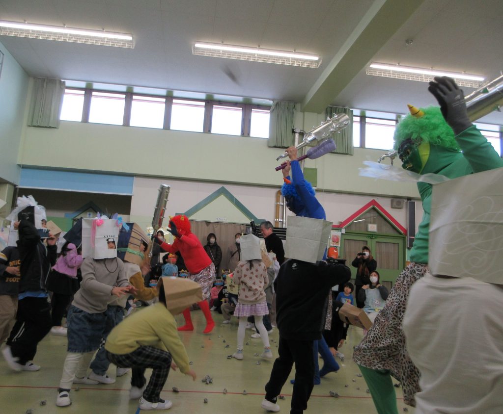 作ったお面をつけて、赤鬼、緑鬼に向かっ