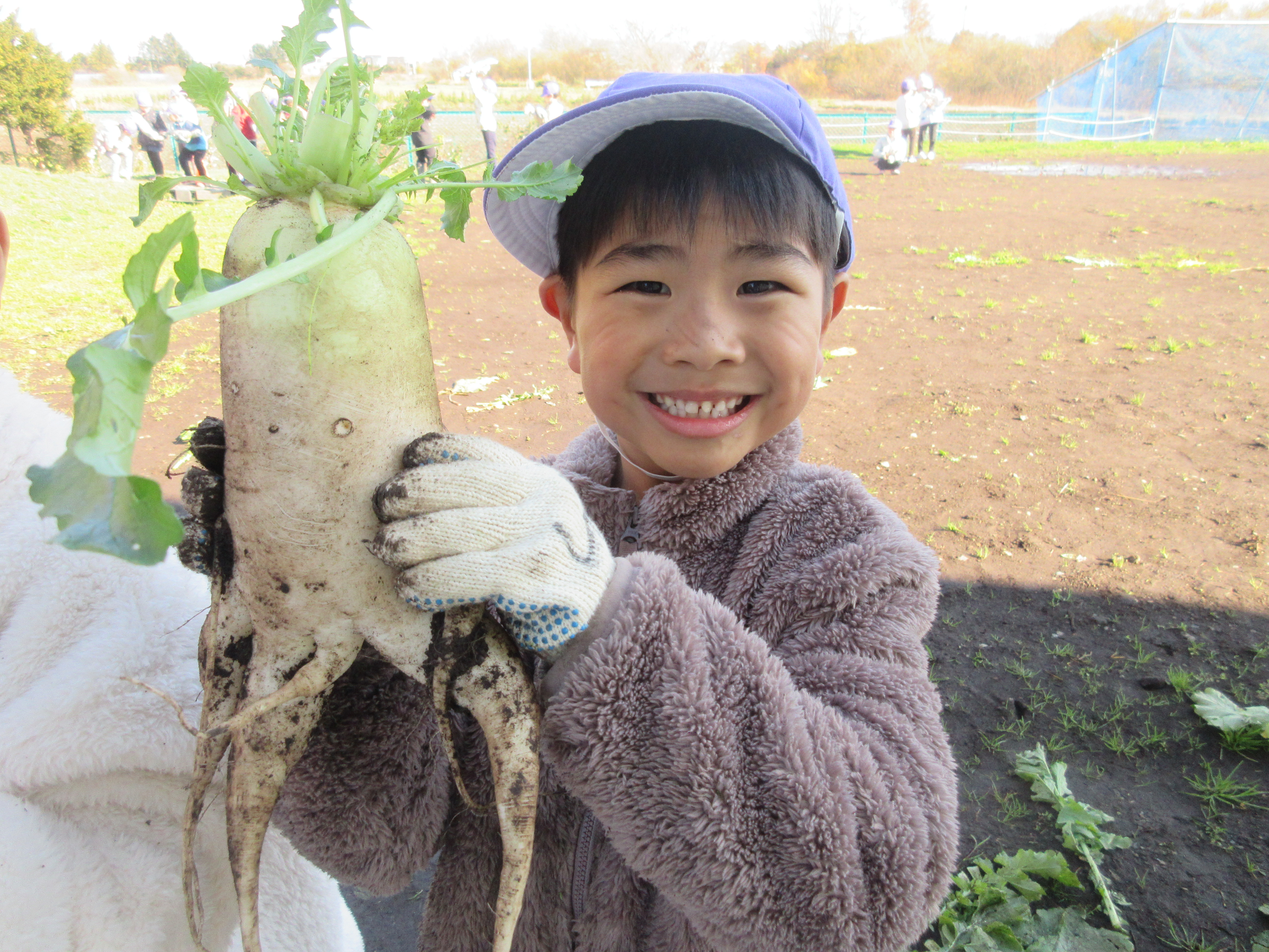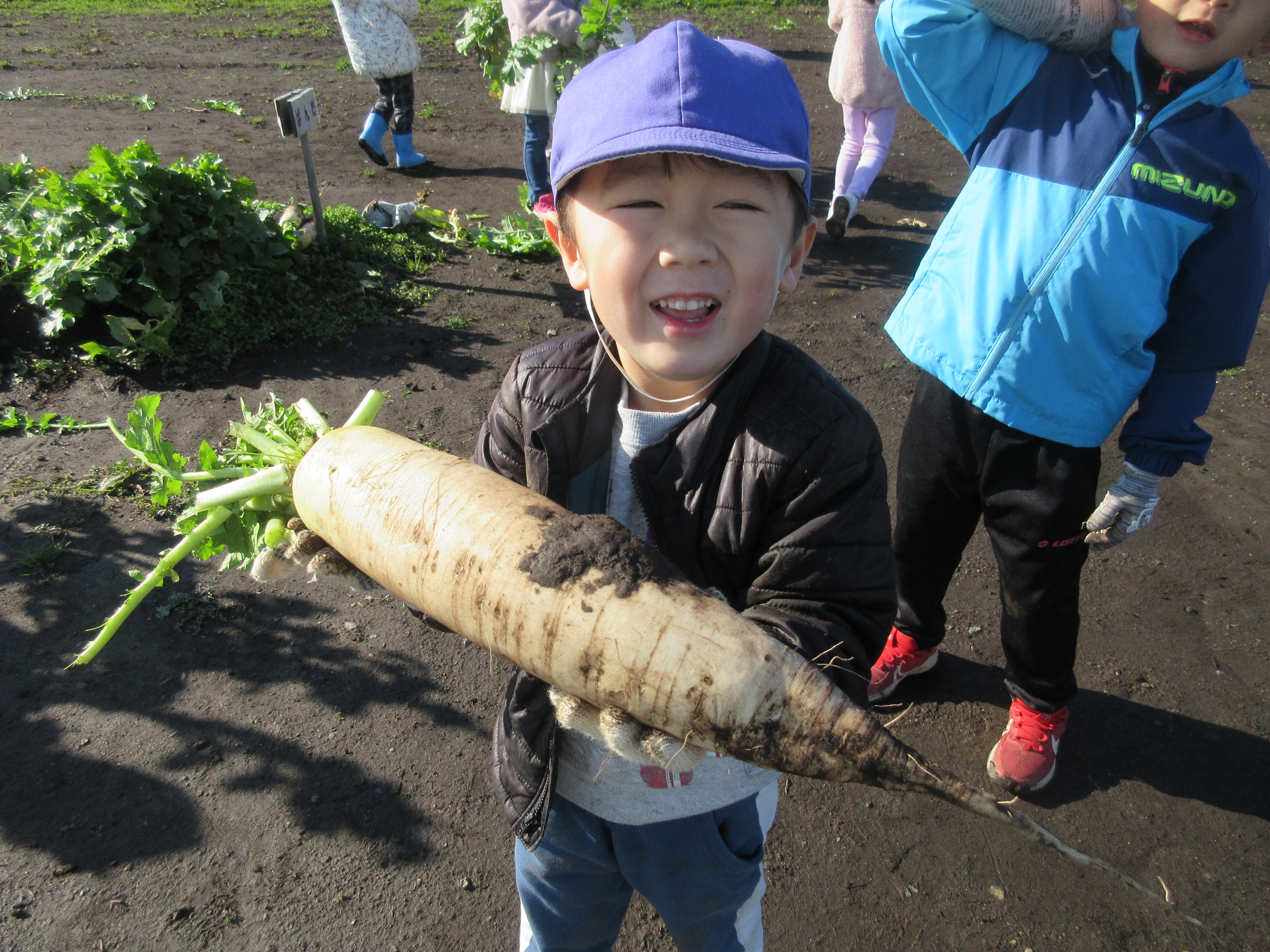 秋から園内にある畑で秋大根を育てています。種から収穫まで体験してすることで、農作物ができあがっていく過程を身近に感じられる環境を整えています。